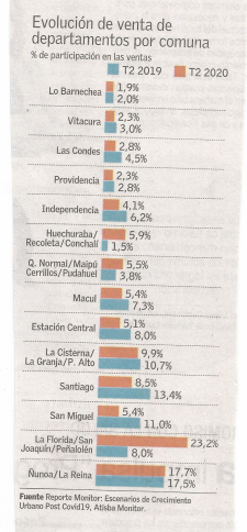 “Con la crisis social y sanitaria esto cambió”, alerta el informe titulado “Escenarios de crecimiento urbano post covid 19”, hecho por Atisba Monitor, el que plasma la composición de las ventas de casas y departamentos e primer y segundo trimestre de este año, y cómo se están distribuyendo por comunas de la capital. ¿El hallazgo? Comunas céntricas han perdido participación en ventas de departamentos, desplazándose la venta hacia otras comunas más alejadas. Y encasas, crece de manera importante la participación de comunas aún más distantes.